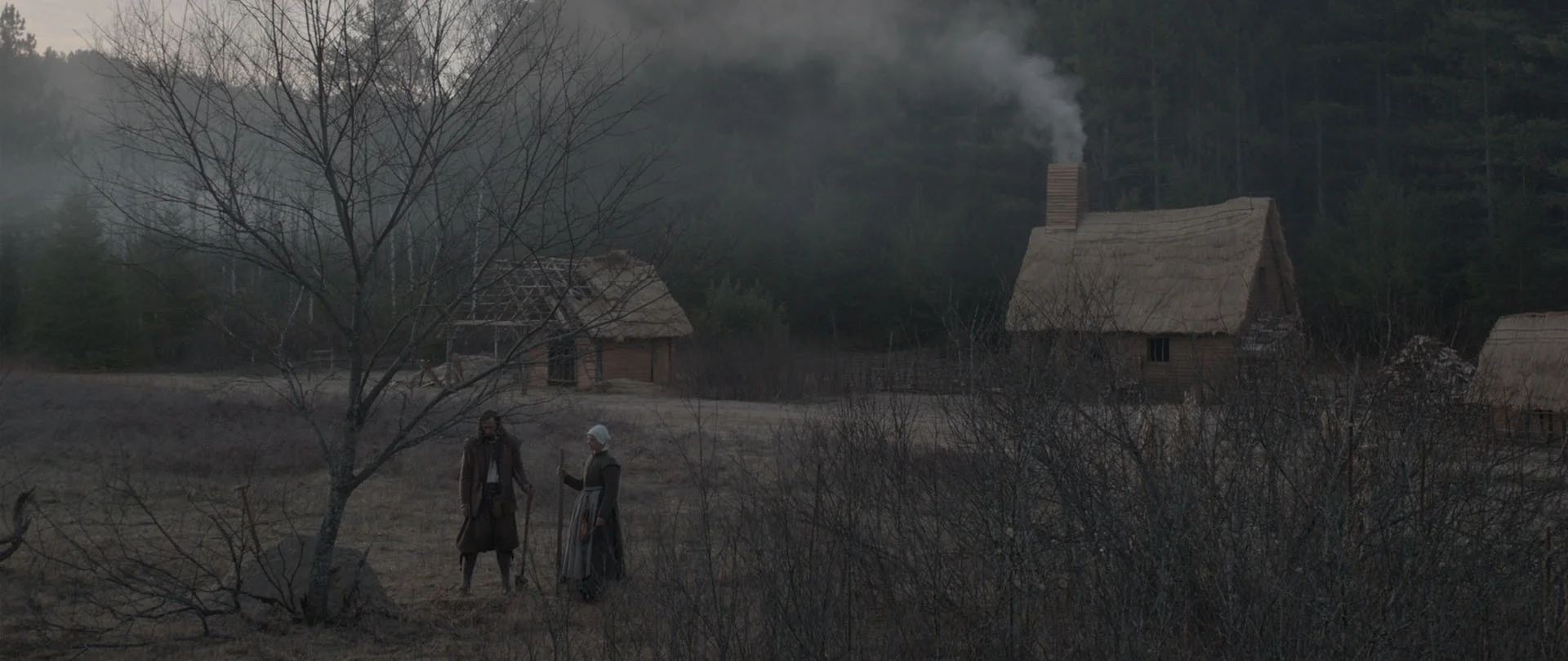 This is only accentuated by the brilliant cinematography on display by Jarin Blaschke whose stable camera and muted colour palate help establish the bleak and melancholy tone that allows the audience to get lost in the visuals, similar to the woods surrounding the small farmhouse. This starkness in the visuals makes the rare instances of reds, oranges or greens all that more important and impactful, adding a sharp contrast to and somewhat jarring jolt into the dreary world we’ve become accustomed to. The haunting visuals are complimented by an equally ominous score by composer Mark Korven, whose minimalist approach seems to serves more to disorient the audience rather than scare them.